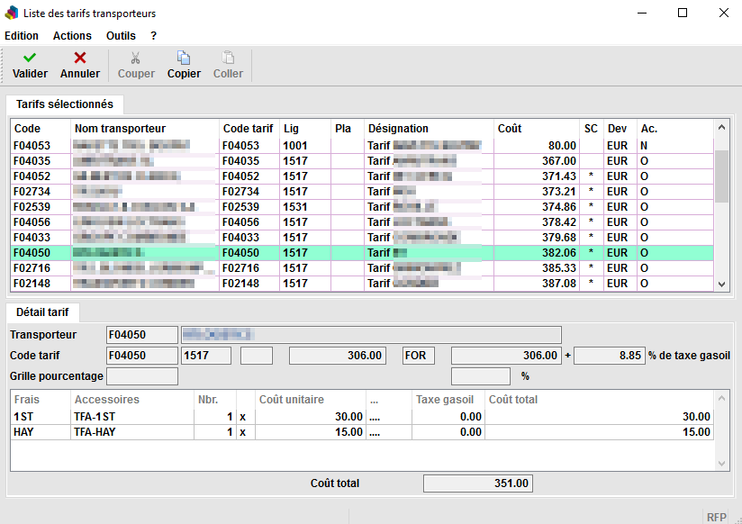 (tarif de base, taxe gasoil, frais n°1, frais n°2, etc.), chacun étant